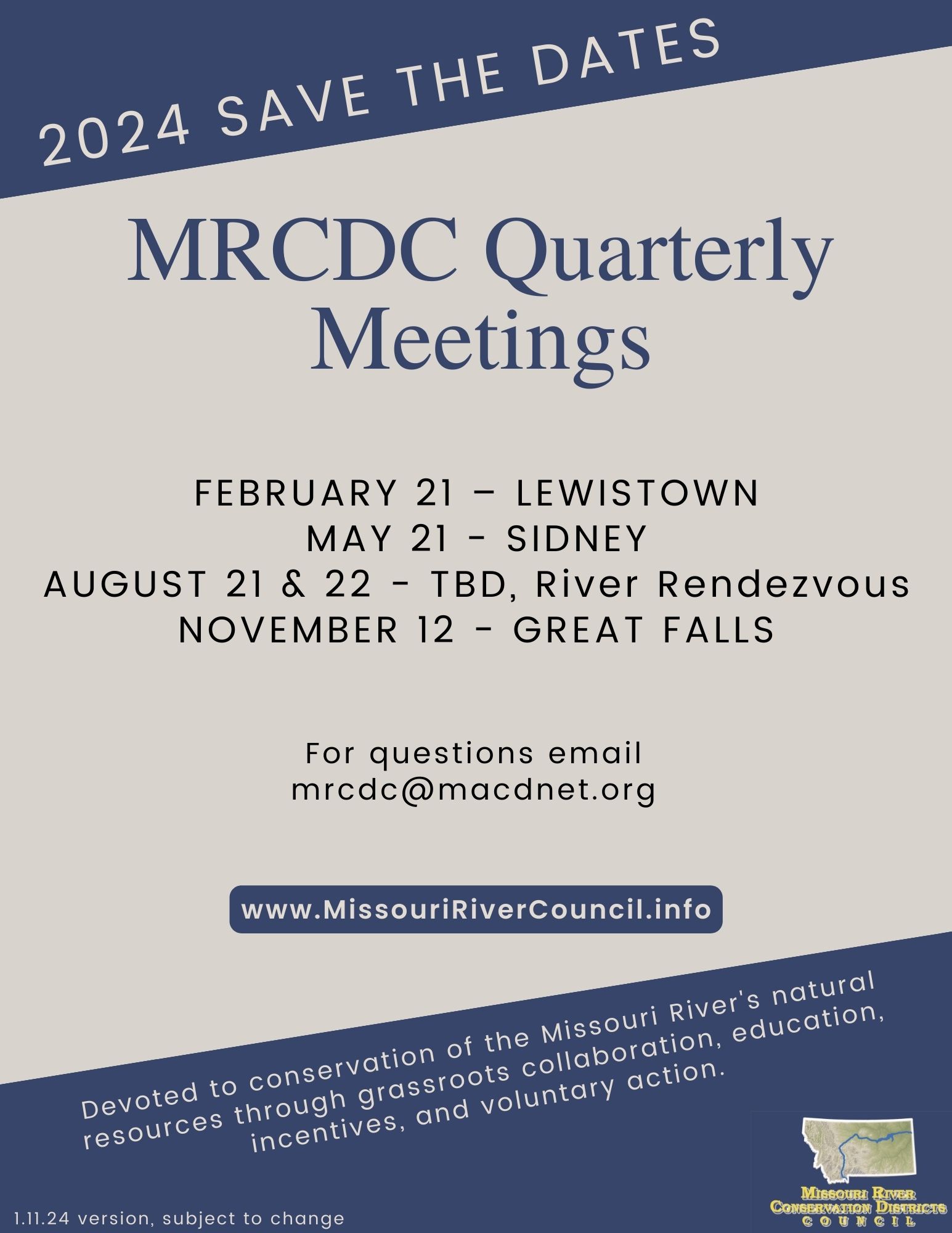2024 MRCDC Quarterly Meetings January 17, 2024 Share This Twitter Facebook LinkedIn Email Related Posts Irrigator Outreach Specialist Job Posting PDF of full job description. River Rendezvous registration, now open! For the most up to date information, visit the River Rendezvous Project page. 2024 River Rendezvous The Missouri River CD Council, Lewis and Clark CD, Broadwater CD, and Petroleum County CD…
